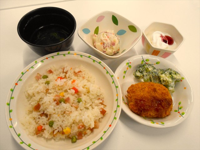 えびピラフ、チーズ入りかぼちゃ揚げ、ポテトサラダ、ババロア、コンソメスープ