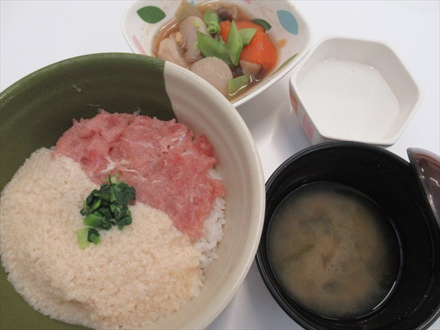 ネギトロとろろ丼、筑前煮、りんごヨーグルトゼリー、みそ汁