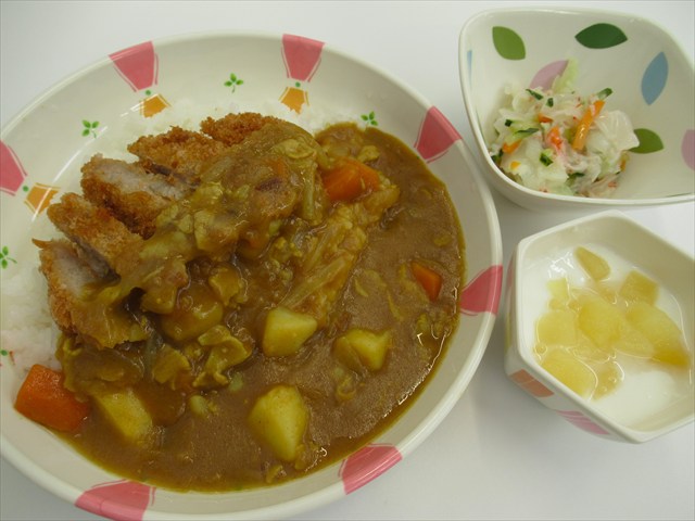 カツカレー、コールスローサラダ、りんごヨーグルト
