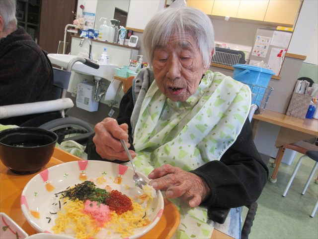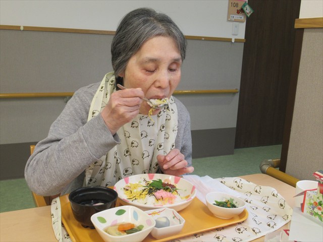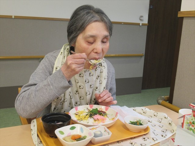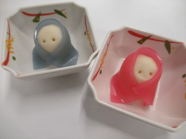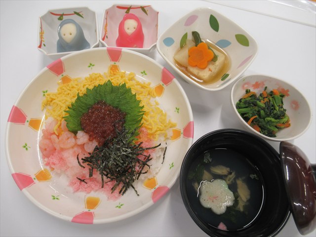 ちらし寿司、炊き合わせ、菜の花の辛し和え、すまし汁、ひな人形饅頭(青赤どちらか1つ)