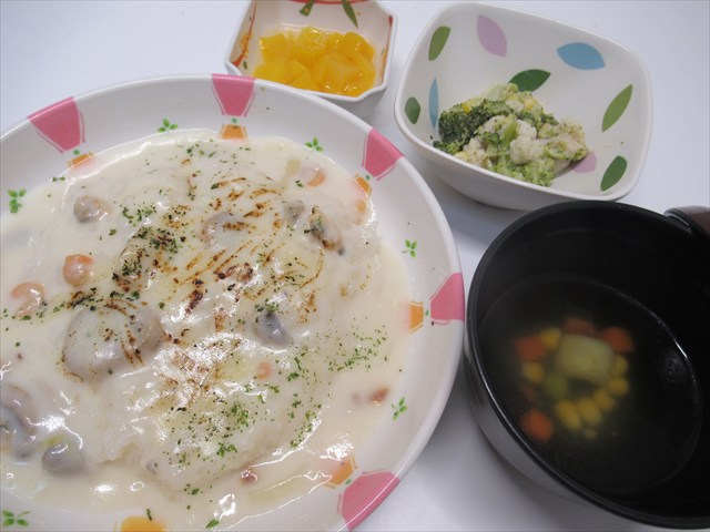 シーフードドリア、ブロッコリーサラダ、マンゴー、コンソメスープ