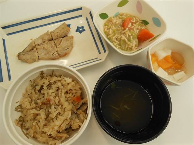 五目ごはん、サバの山椒味噌焼き、里芋のそぼろ煮、杏仁フルーツ、すまし汁
