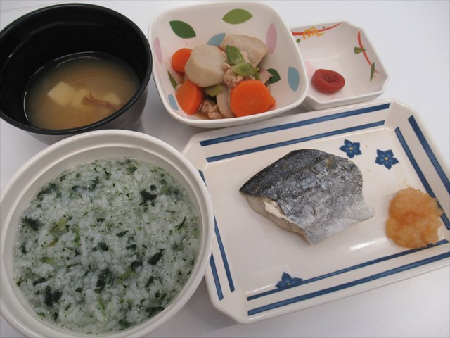 七草粥、さわらの塩焼き、鶏肉と里芋の煮物、梅干し、みそ汁