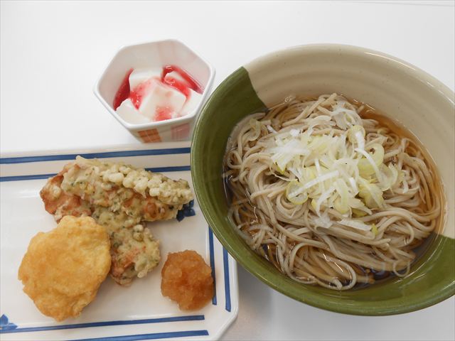手打ちそば、とり天、ちくわの磯部揚げ、杏仁豆腐