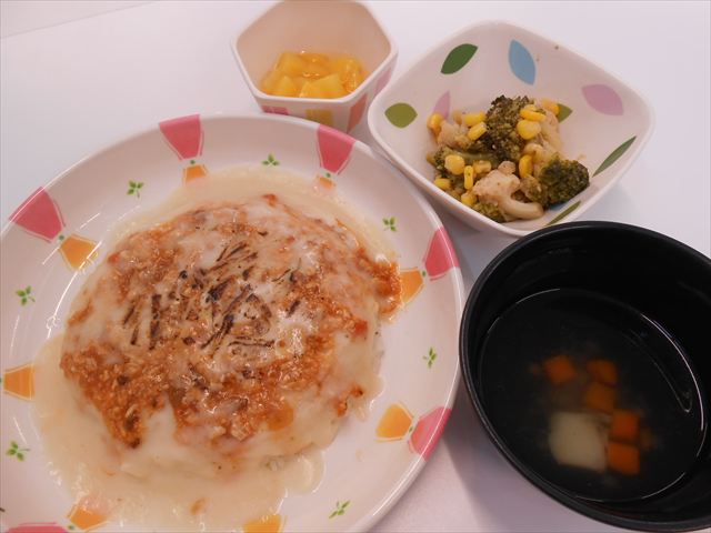 ミートソースドリア、ブロッコリーサラダ、黄桃、コンソメスープ