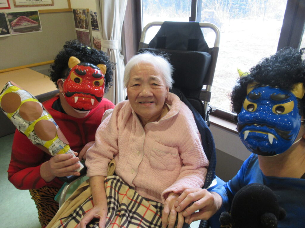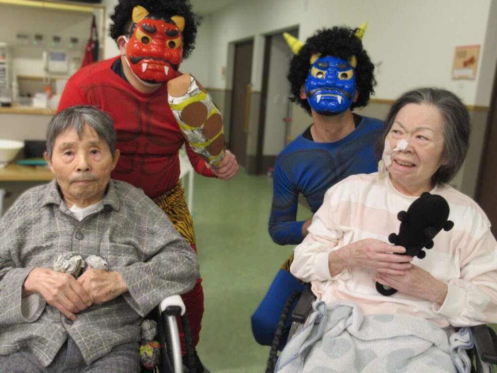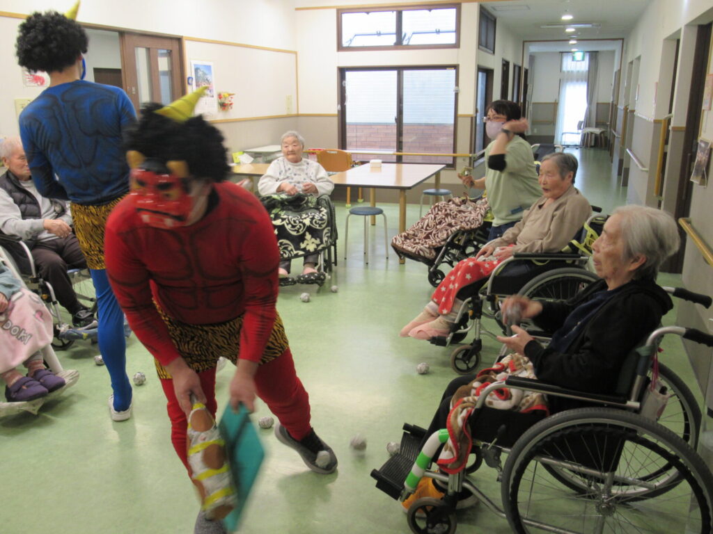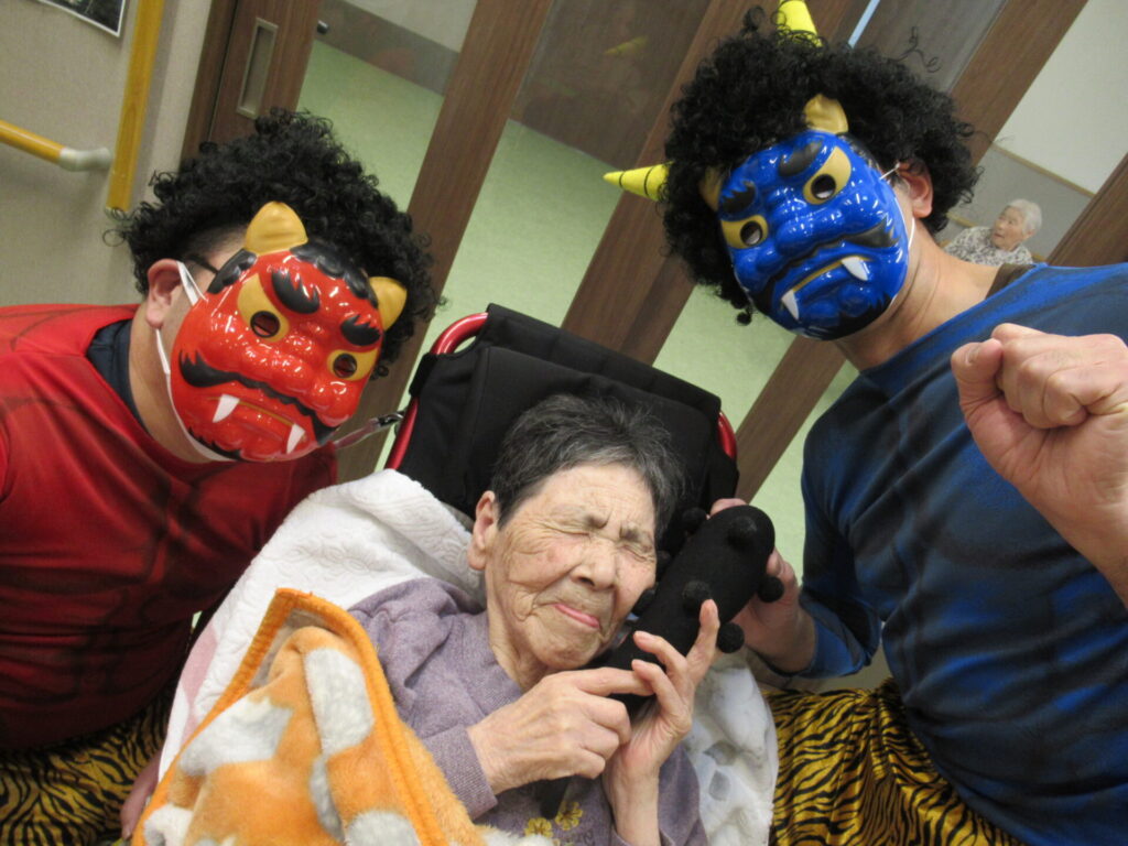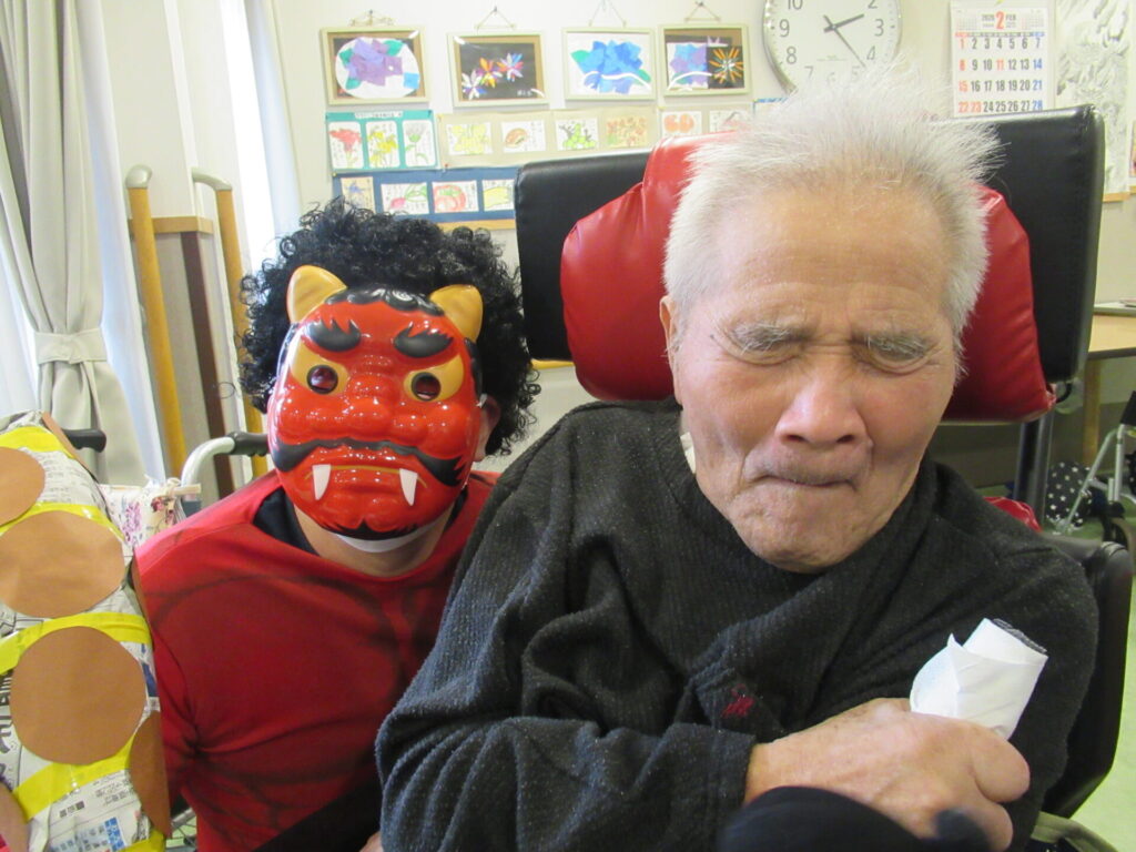 鬼に一生懸命まめを投げて倒そうとしている方、鬼を怖がっている方