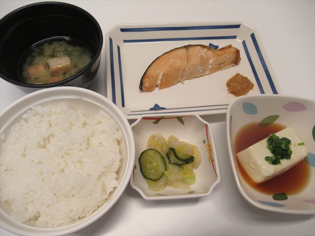 ごはん、焼き鮭、冷奴、浅漬け、みそ汁