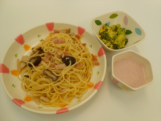 きのこ和風パスタ、ミモザサラダ、いちごムース